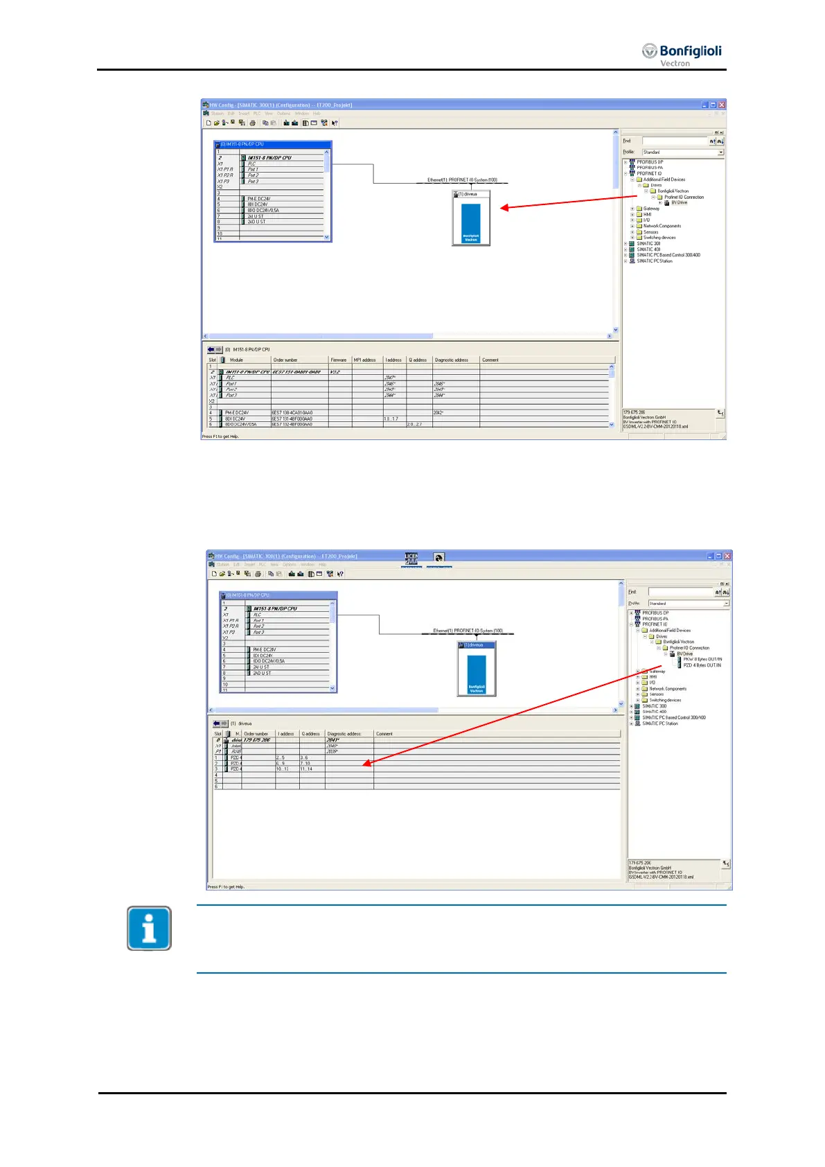 The screen shot of the STEP7 hardware configurator shows a frequency inverter