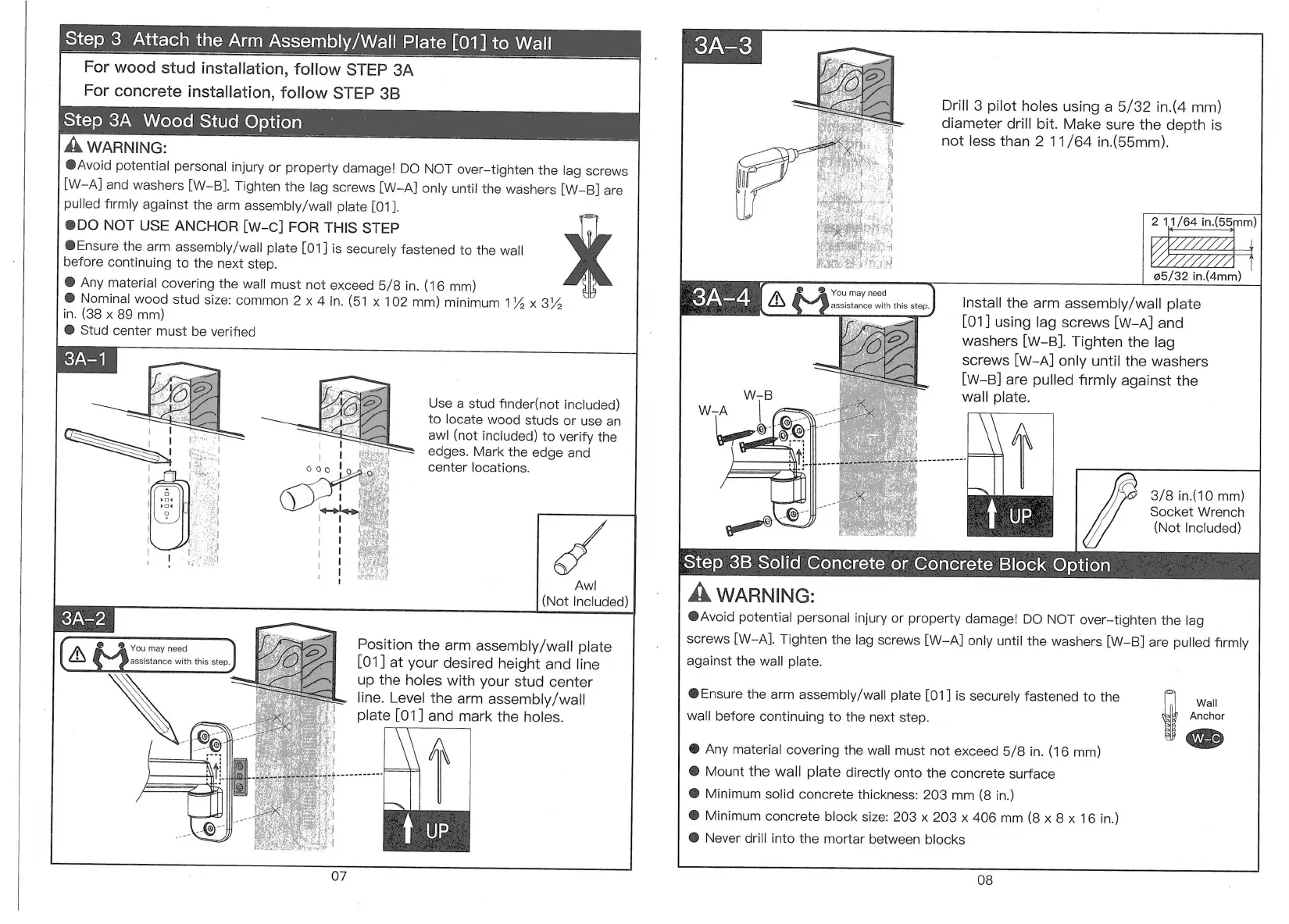 BONTEC GWM01 - Step 3: Attach Arm Assembly;Wall Plate to Wall; Wood Stud Installation (Step 3 A); Concrete;Block Installation (Step 3 B)