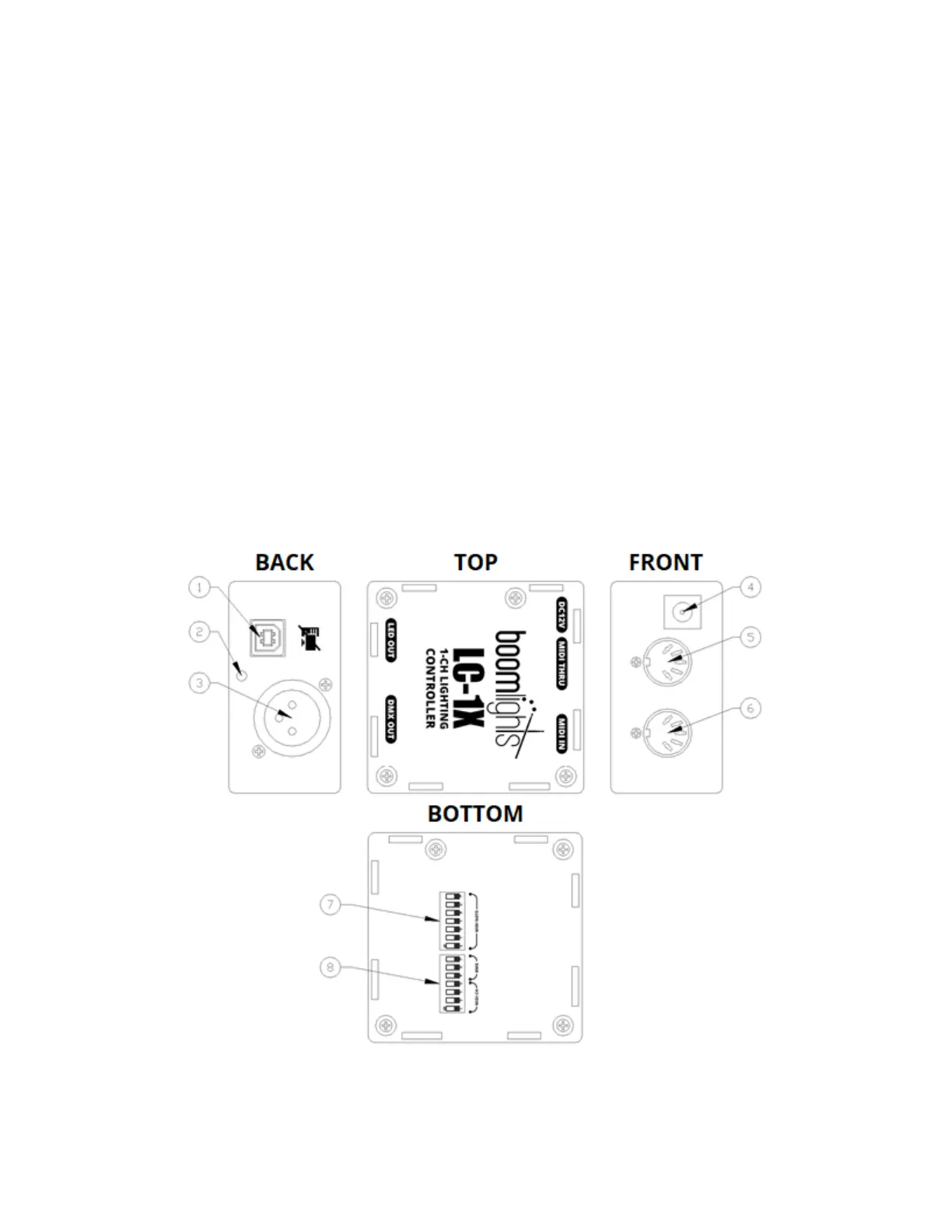 8 – MIDI Channel / DMX DIP Switch: DIP switch used to set which MIDI channel the unit will