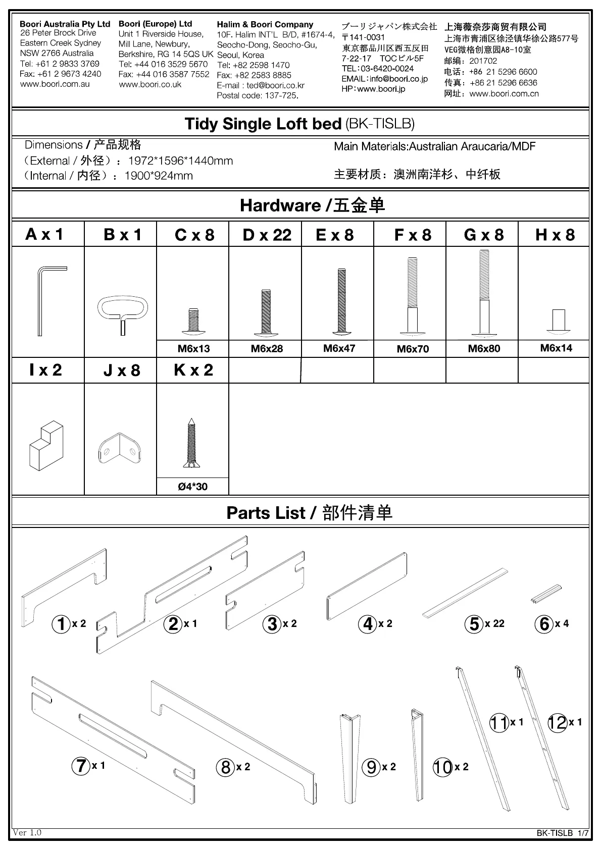 boori Tidy - Product Specifications and Components; Product Dimensions and Materials; Hardware Identification; Parts List