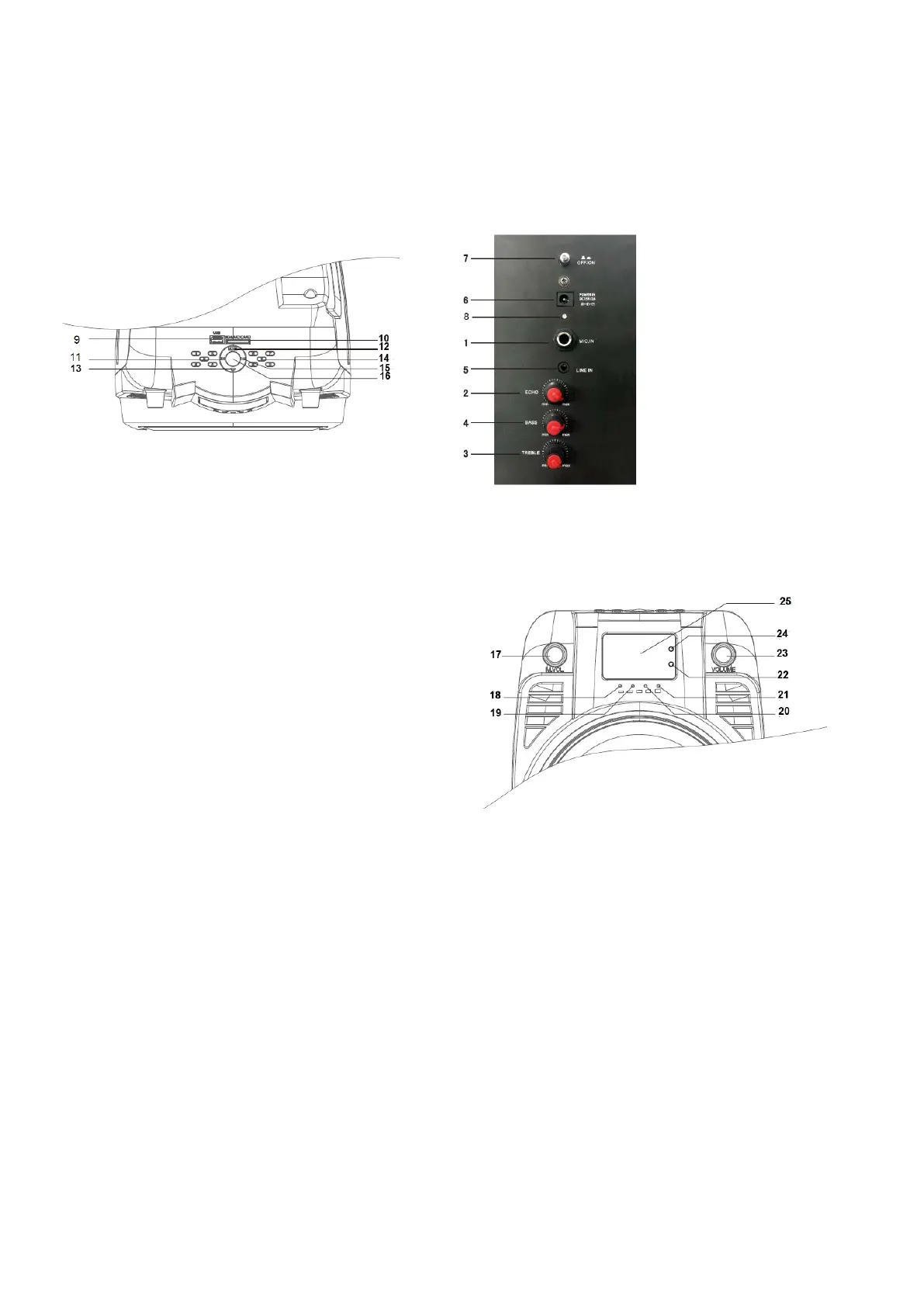24. Verklikkerlampje spanning in Bluetooth (knippert wanneer de speaker met Bluetooth werkt)