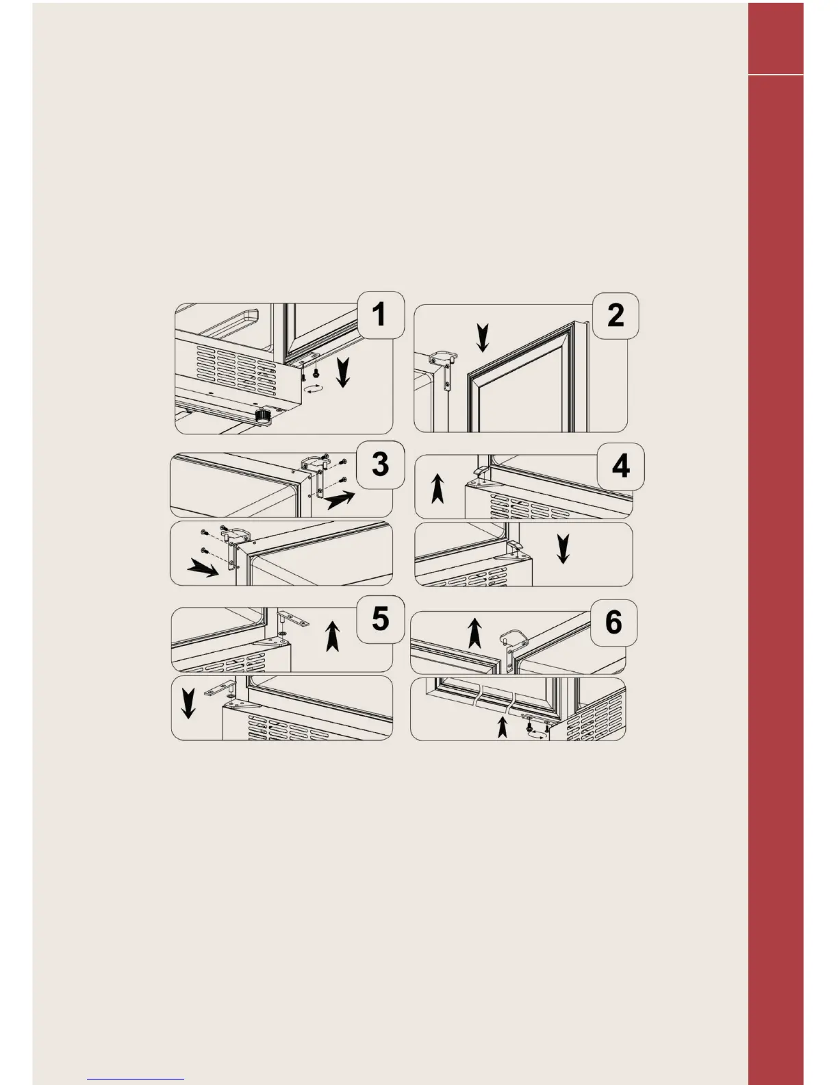 * Open the door, remove the two screws in the bottom hinge and lift