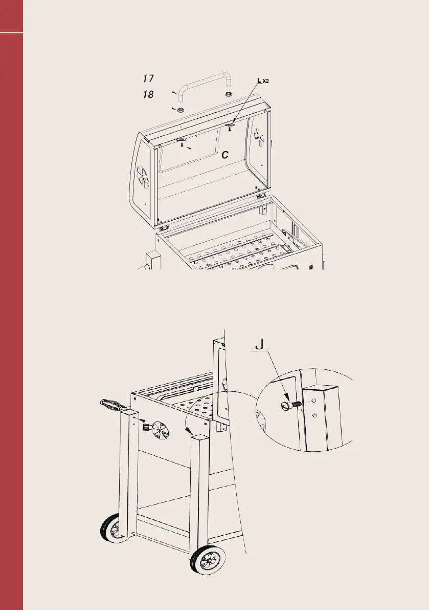 Avaa ruuveja osittain (J), kokoa sivupöytä, jossa on koukut ja kiristä ruuvit (J)