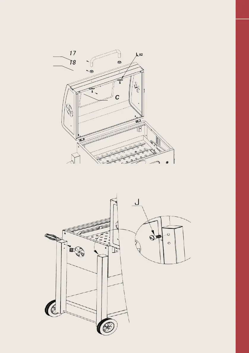 Monteer het handvat (met bijverpakte ringen) met 2 bouten C en 2 ringen L aan