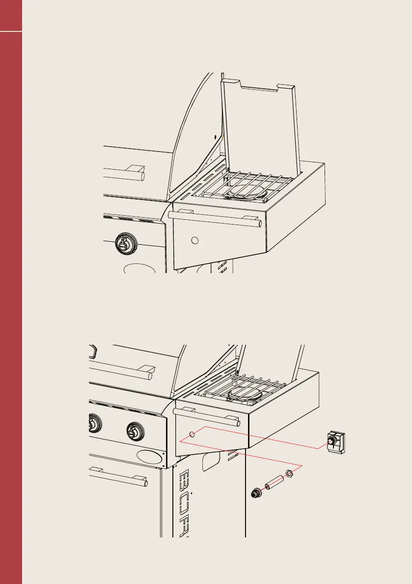 Installera sidobrännaren med de två M4x5-skruvarna. Anslut kastrullstödet.