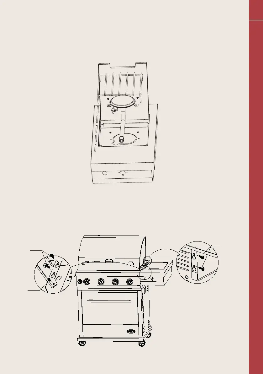 b) Faites glisser le brûleur latéral avec les découpages sur les quatre vis
