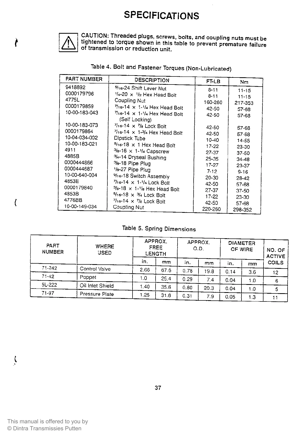 Borg Warner 71C - Specifications; Bolt and Fastener Torques (Non-Lubricated); Spring Dimensions