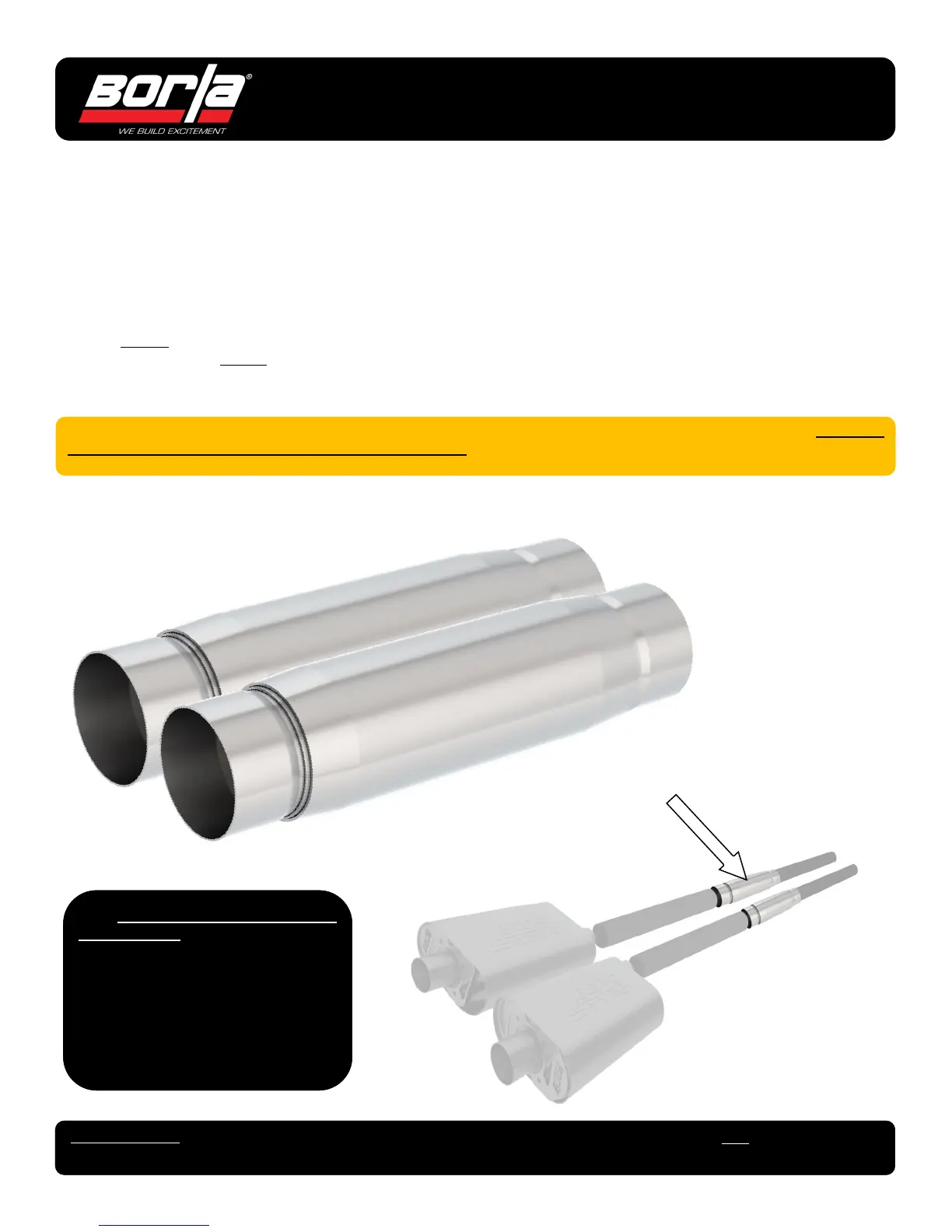 stainless steel, and backed by the Borla Million-Mile Warranty. Borla recommends welding (not clamping) the Borla Touring Res-