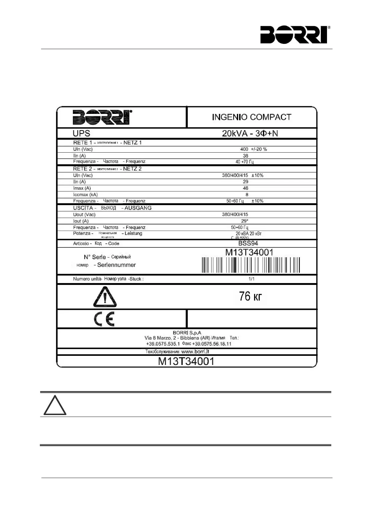 Рисунок 1 – заводская табличка INGENIO COMPACT 10÷20 кВА