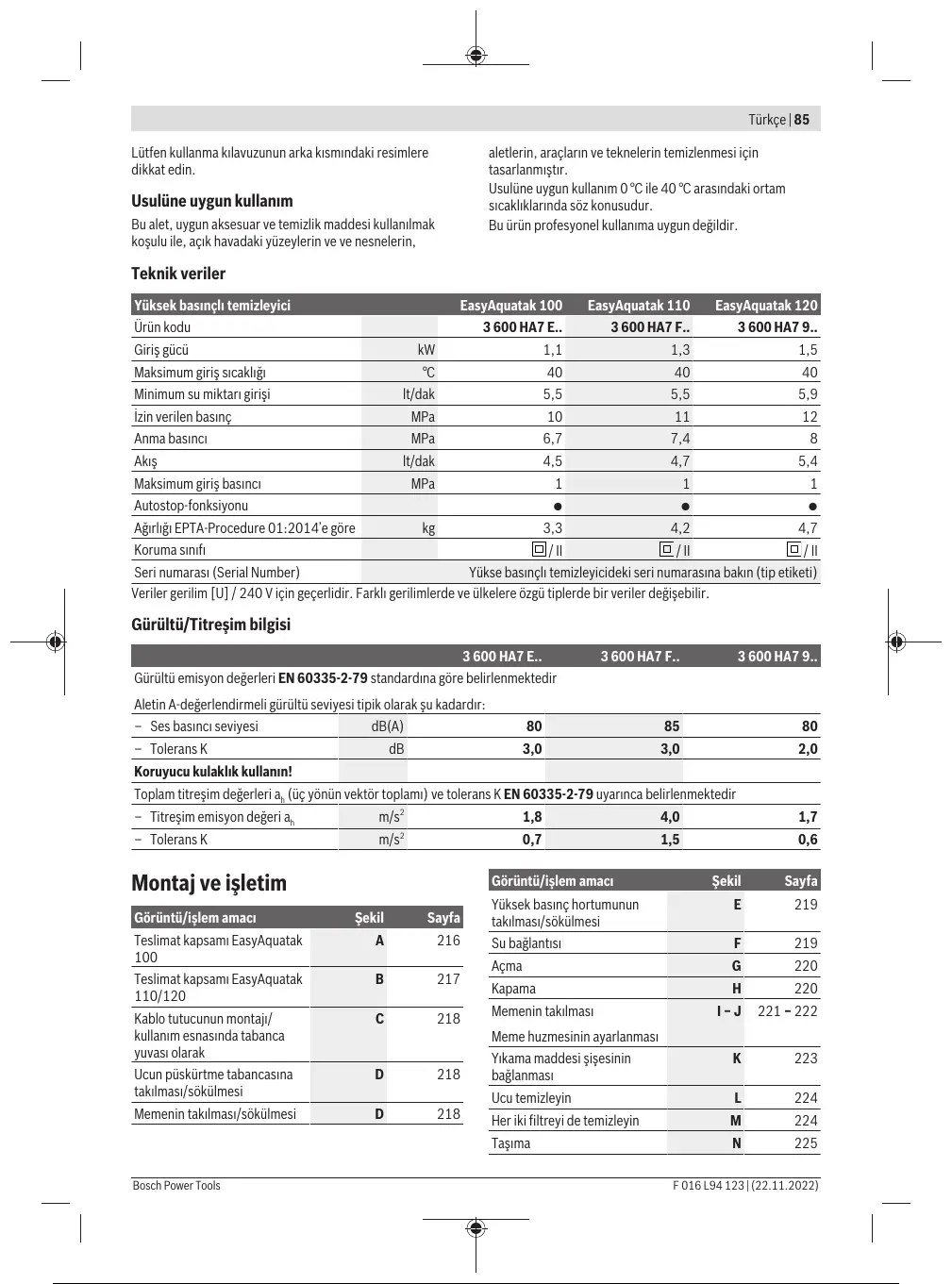 (üç yönün vektör toplamı) ve tolerans K EN 60335-2-79 uyarınca belirlenmektedir