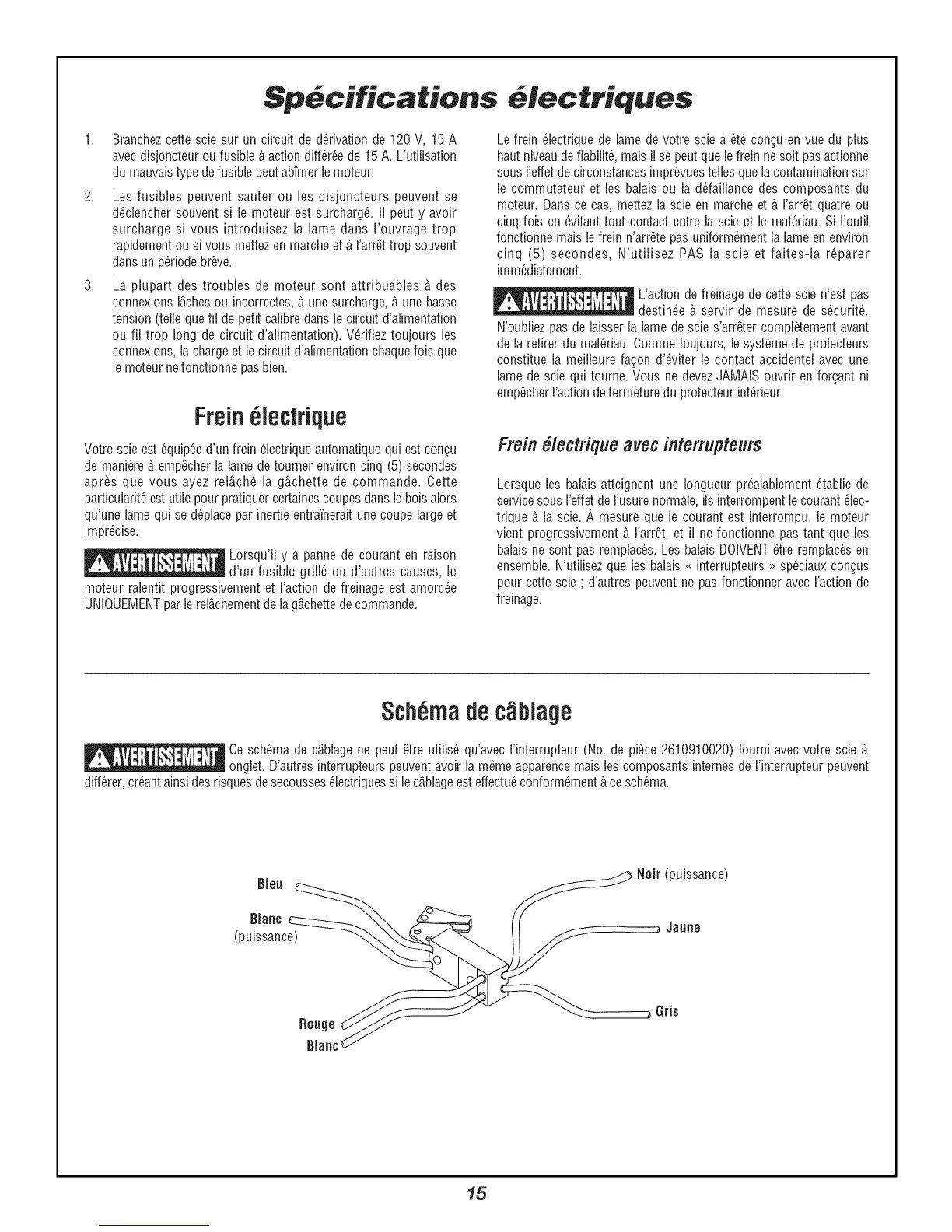 Ce sch6ma de c_,blagene peut _,treutilis6 qu'avec I'interrupteur (No. de piece 2610910020) fourni avec votre scie b,