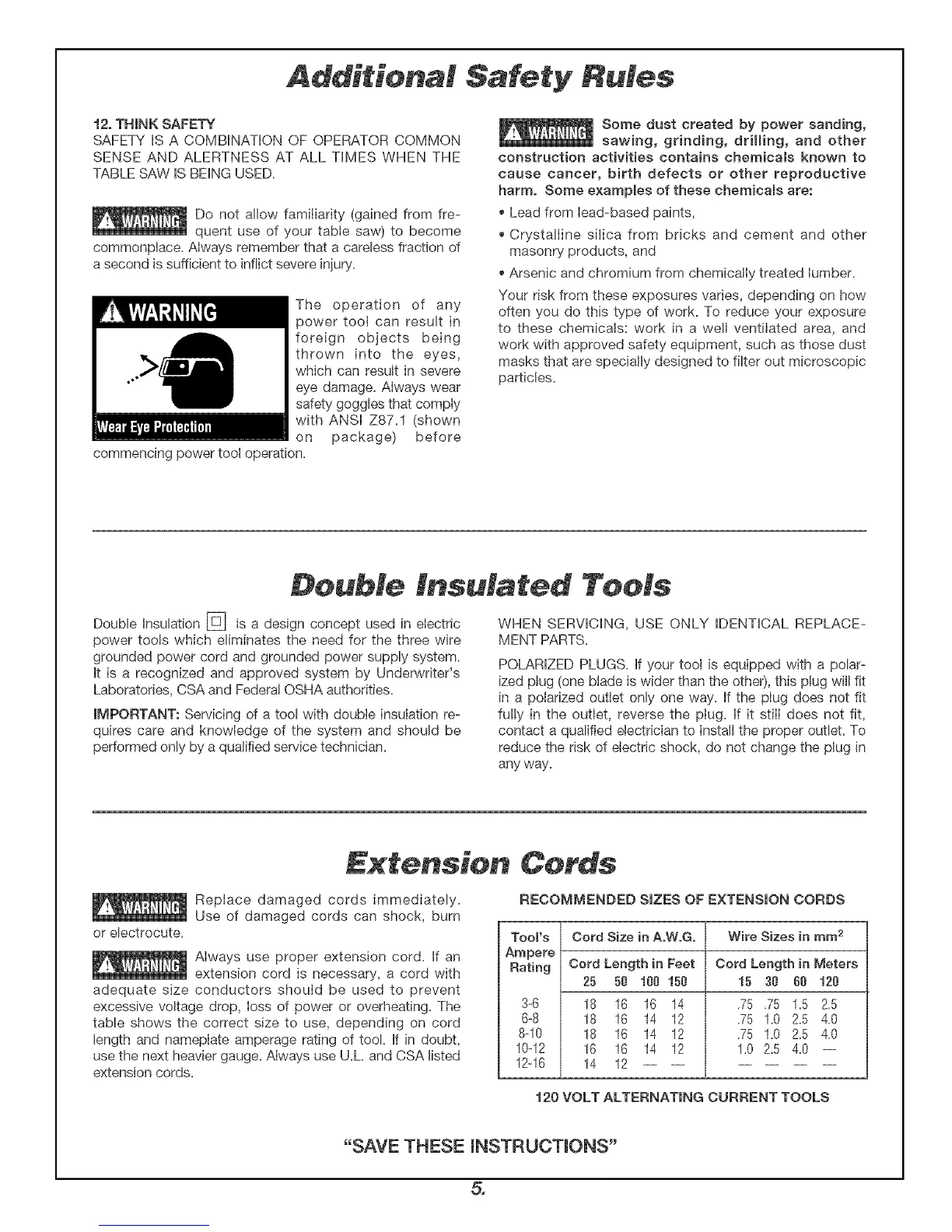 RECOMMENDED SIZES OF EXTENSION CORDS