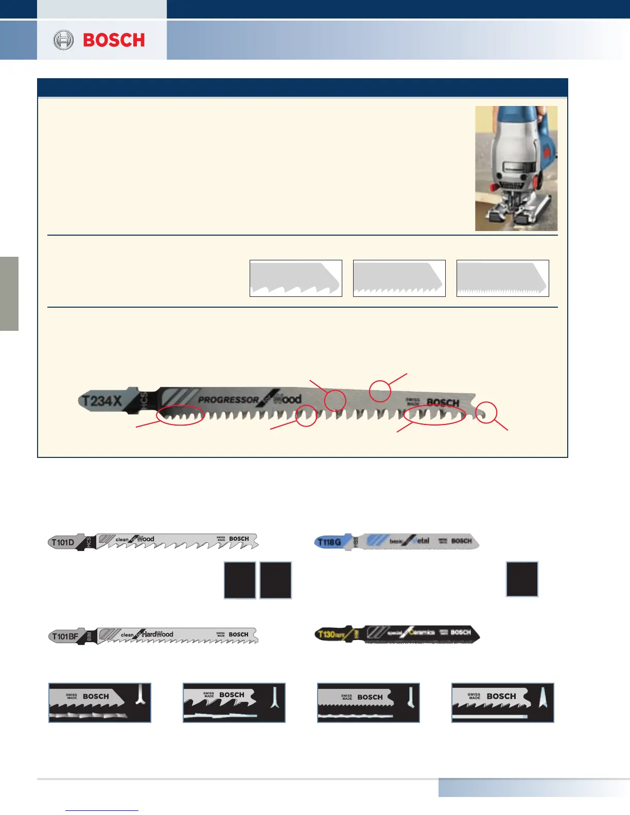 quickly, smoothly and precisely. Bosch’s optimized jig saw blade configurations cut precisely and easily in