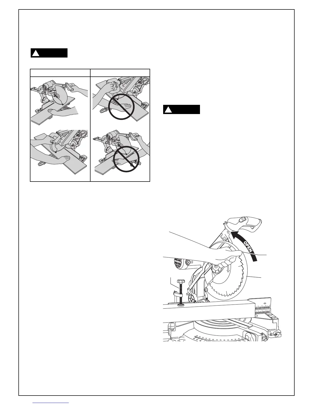 sawblade. Keep hands out of the path of sawblade.