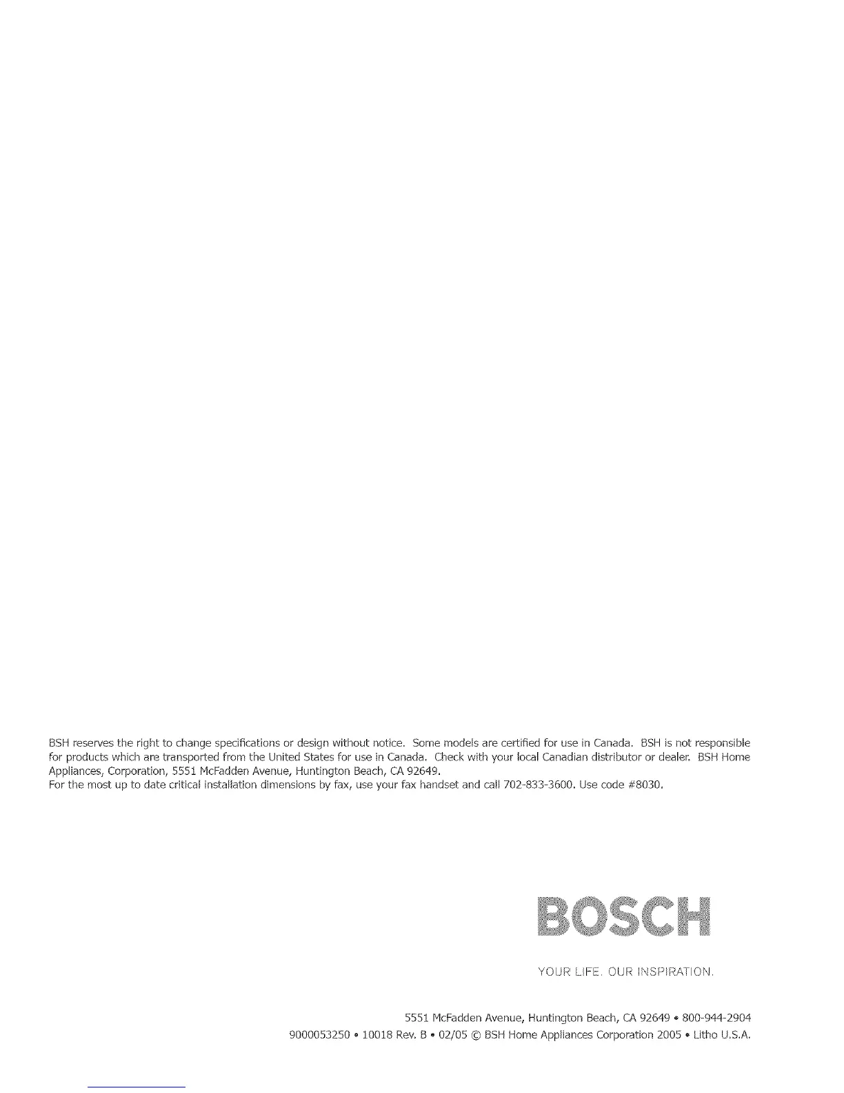 9000053250 • 10018 Rev. B _ 02/05 © BSH Home AppFiances Corporation 2005. Litho U.S.A.