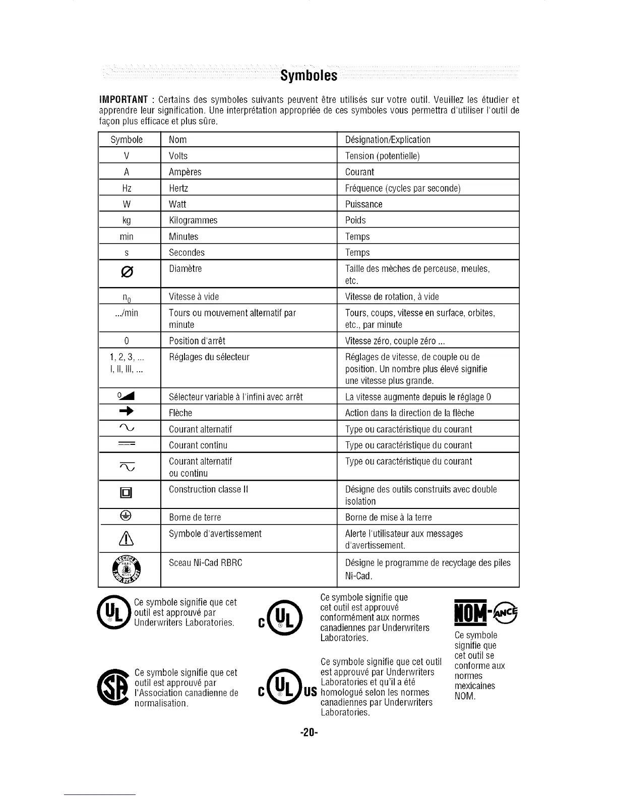 IMPORTANT : Certains des symboles suivants peuvent etre utilis_s sur votre outil. Veuillez les _tudier et