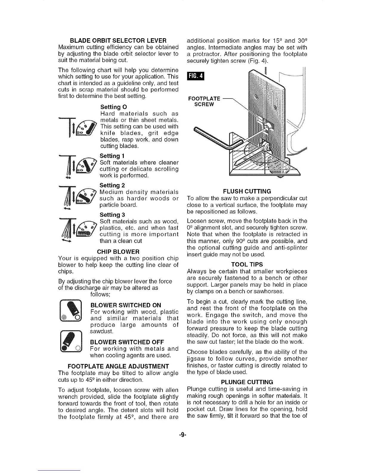 Bosch 52314 - Blade Orbit Selector Lever; Chip Blower Adjustment; Footplate Angle Adjustment; Flush Cutting Technique