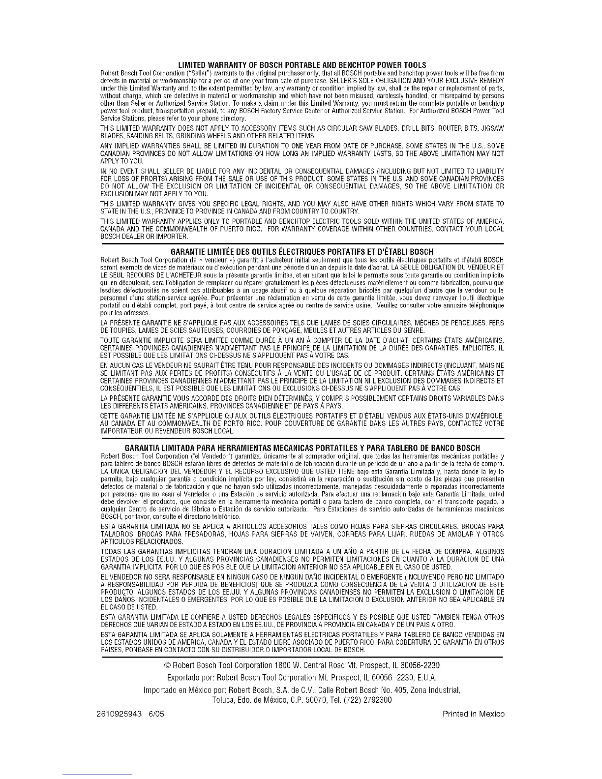 Robert Bosch Tool Corporation (le <<vendeur ,,) garantit _ I'acheteur initial seulement que tous lee outils 61ectriques portatifs et d'6tabli BOSCH