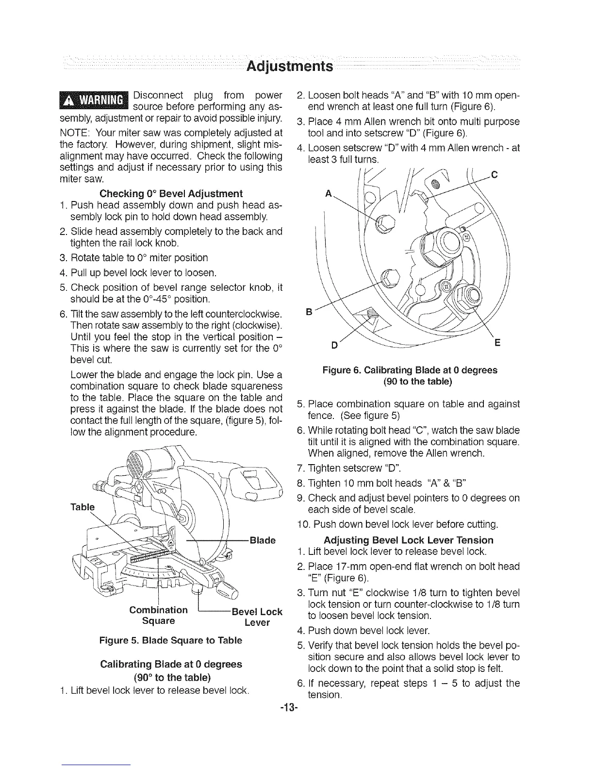 3. Turn nut "E" clockwise 1/8 turn to tighten bevel