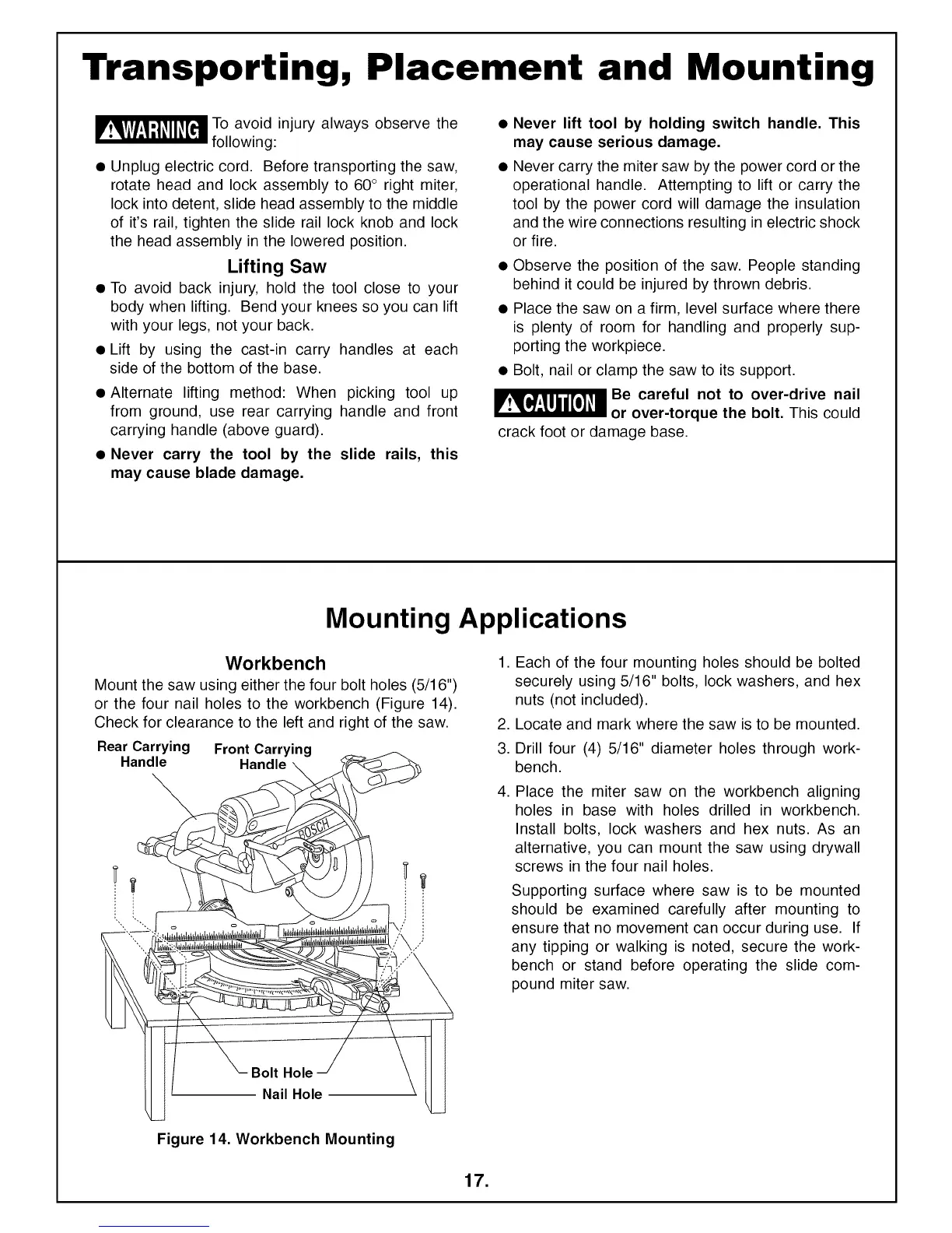 • Unplug electric cord. Before transporting the saw,