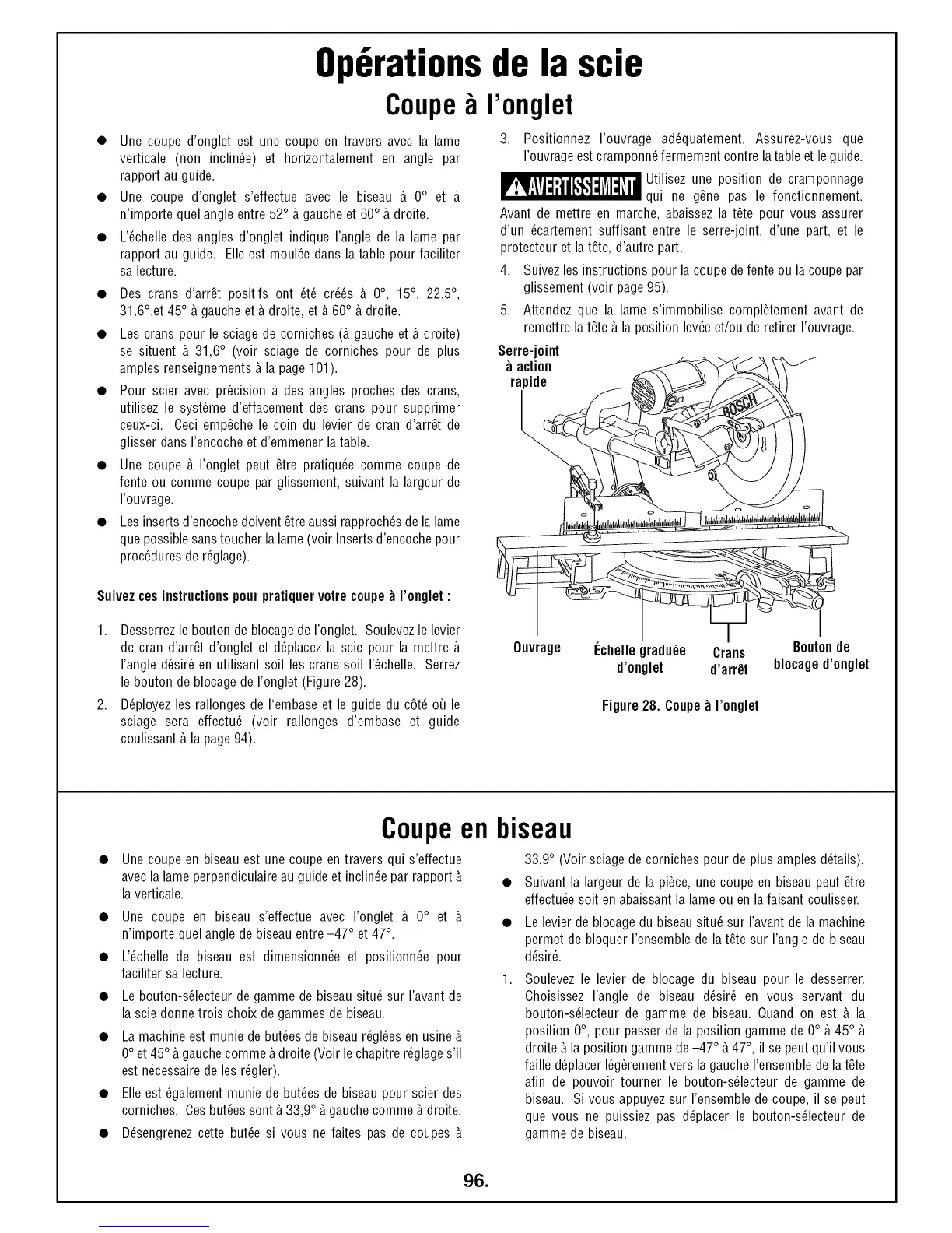 • Une coupe d'onglet s'effectue avec le biseau _. 0° et _.