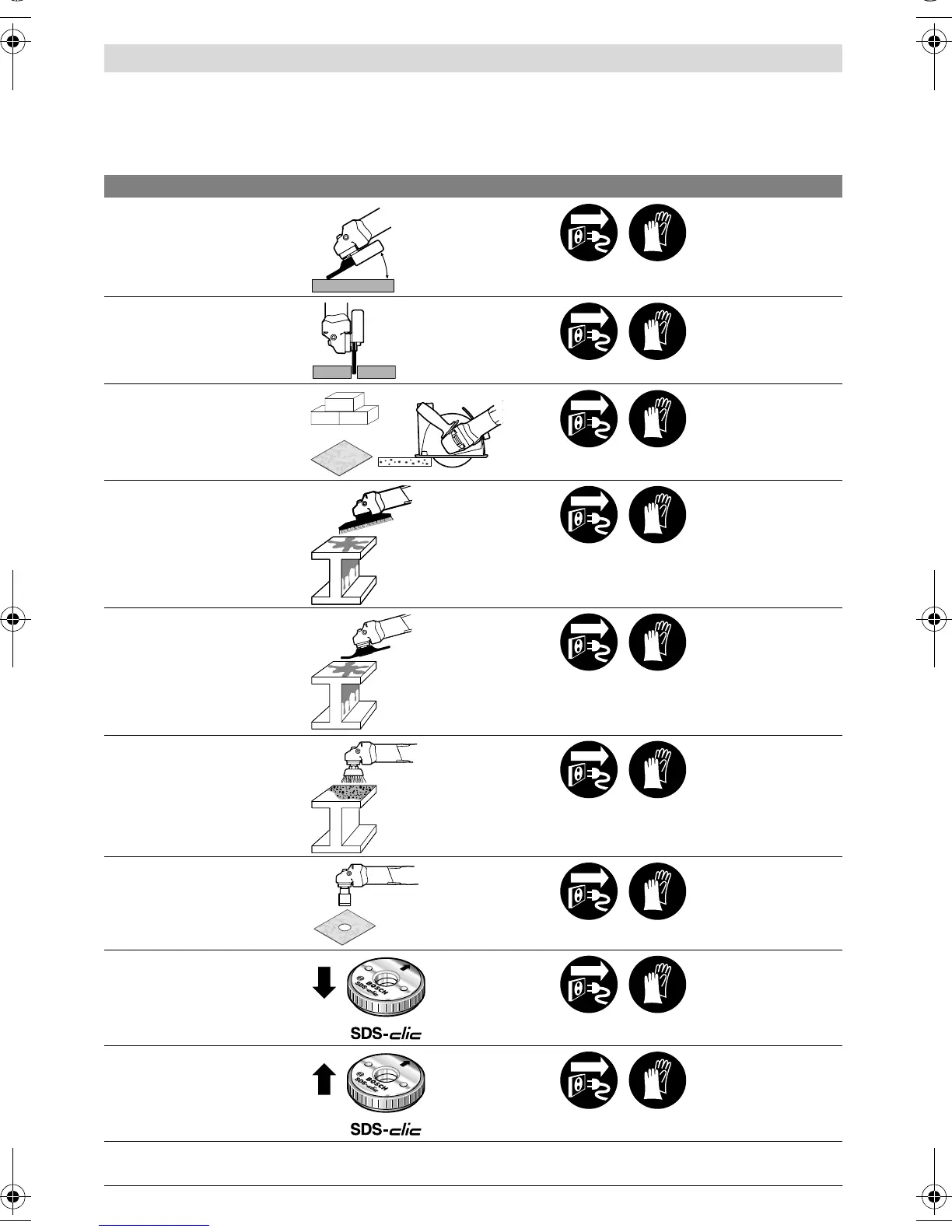 Die folgende Tabelle zeigt die Handlungsziele für Montage und Betrieb des Elektrowerkzeugs. Die Anweisungen der Handlungs-