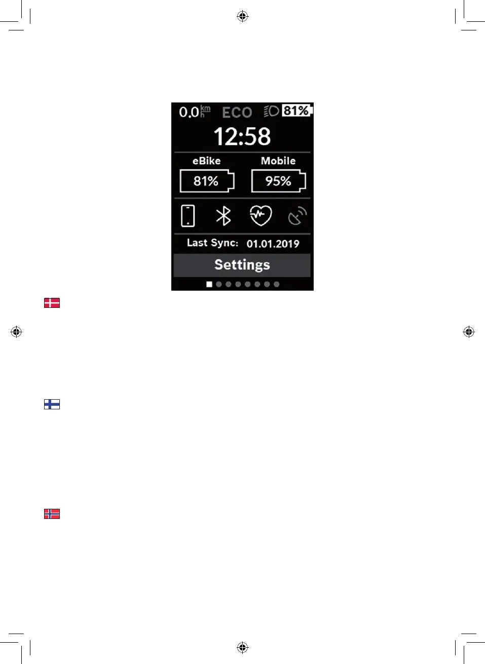 – <Registration (Registrering)> – <My eBike (Min eBike)> – <My prole (Min prol)> – <Bluetooth>– <Sys settings (Systeminnstillin-