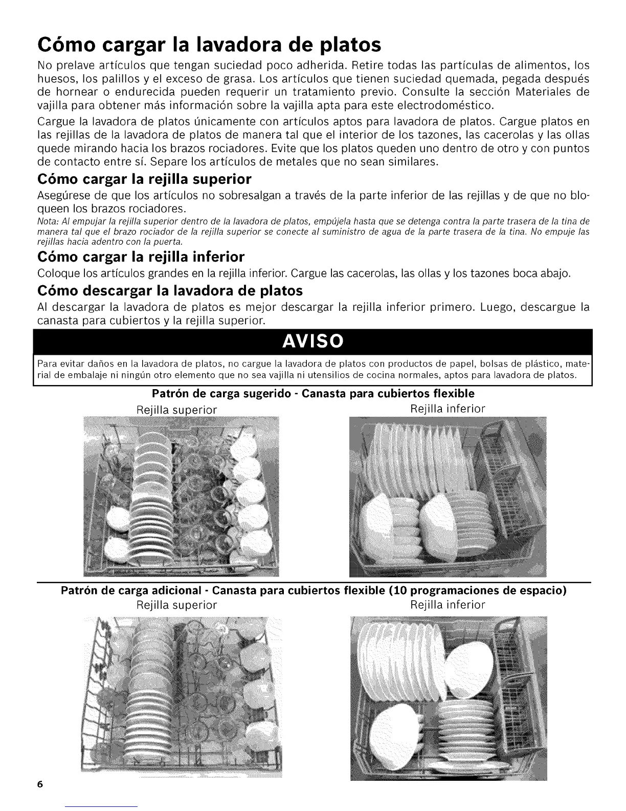 Para evitar da_os en la lavadora de platos, no cargue la lavadora de platos con productos de papel, bolsas de plAstico, mate-