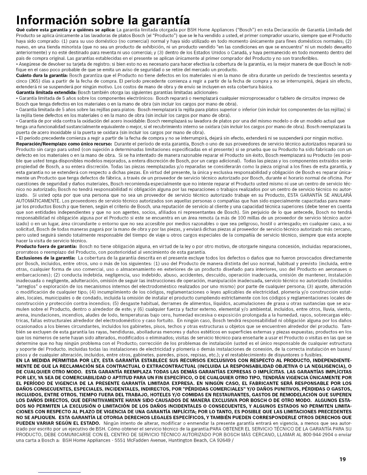 Qud cubre esta garantia y a qui_nes se aplica: La garantia limitada otorgada por BSH Home Appliances ("Bosch") en esta Declaraci6n de Garantia Limitada del