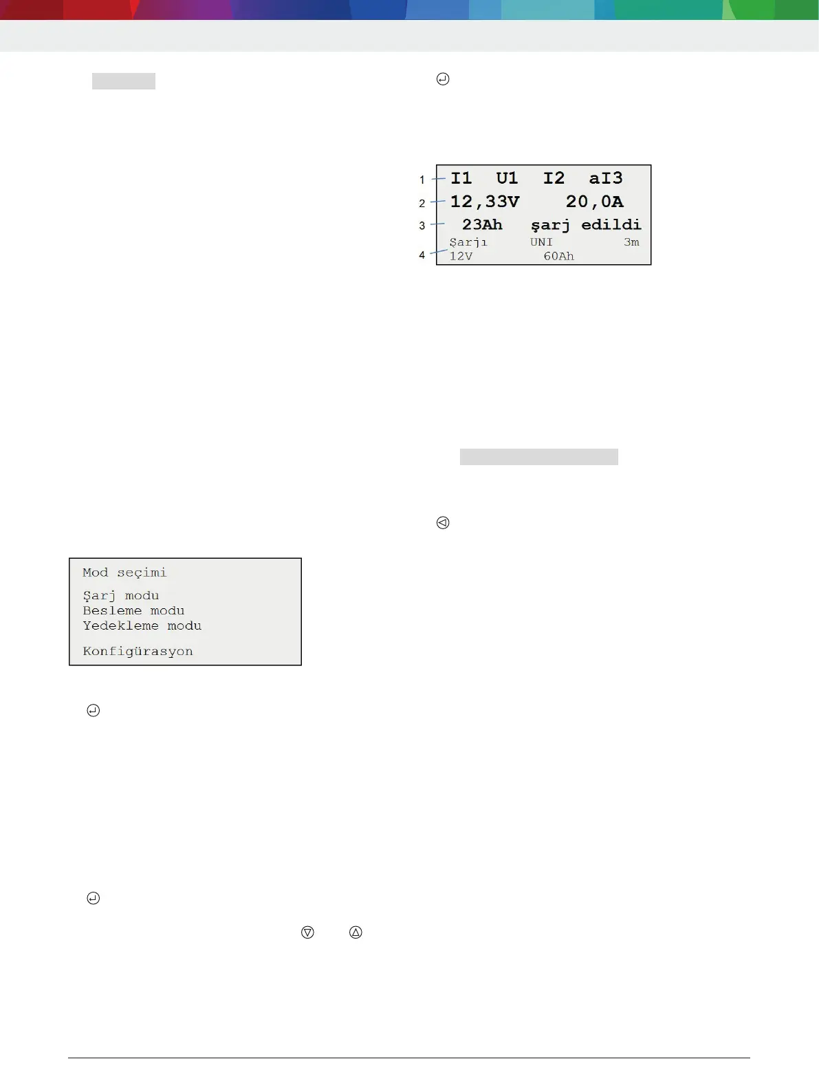4 Çalışma modu, akü tipi, şarj kablosu uzunluğu, akü gerilimi ve