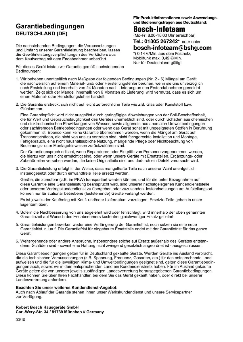 Bosch BHS2 - German Warranty and Contact; German Warranty Terms; Bosch-Infoteam Contact
