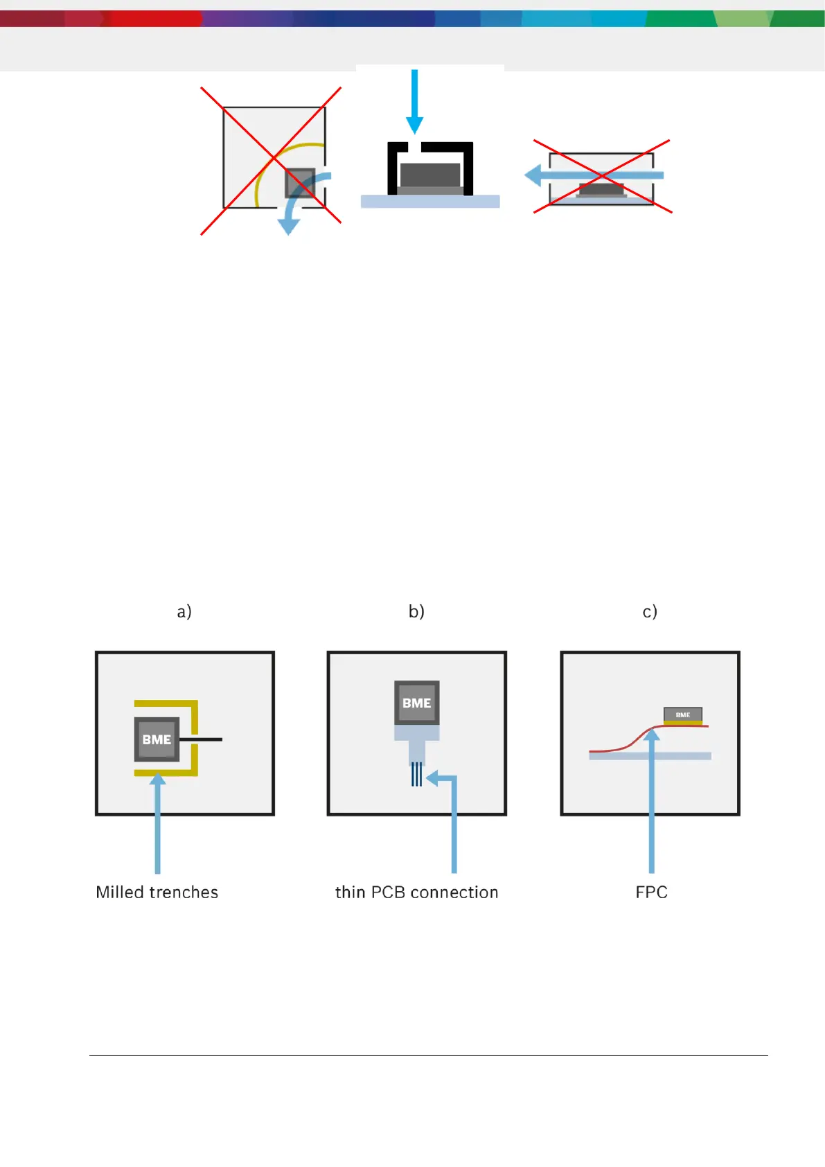 Figure 5: Thermal decoupling of the sensor from the PCB by means of milled trenches (a) or small PCB connections