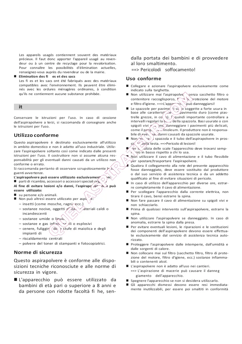 Questo aspirapolvere è destinato esclusivamente all'utilizzo