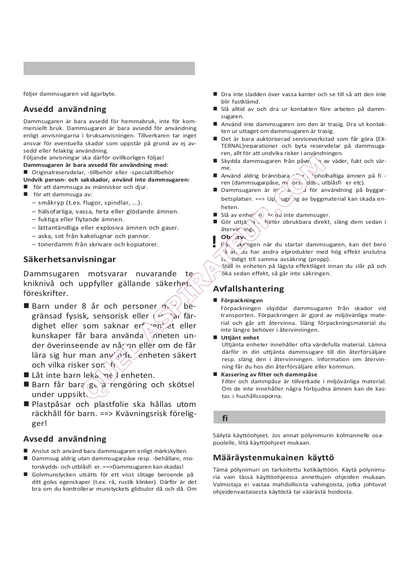 Dammsug aldrig utan dammsugarpåse resp. -behållare, mo-