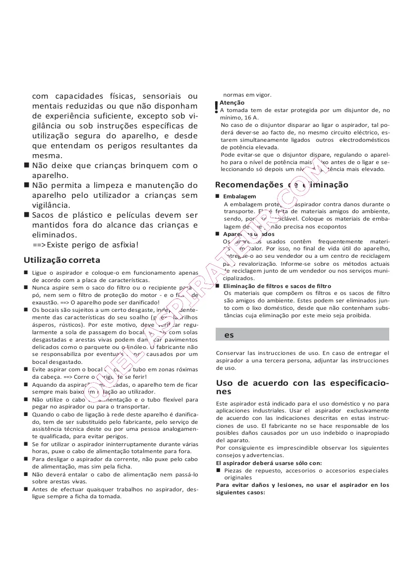 stituição de peças no aspirador só podem ser efectuadas