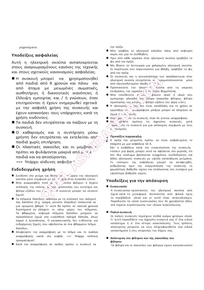ηλεκτρική σκούπα επιτρέπεται να πραγµατοποιούνται µόνο