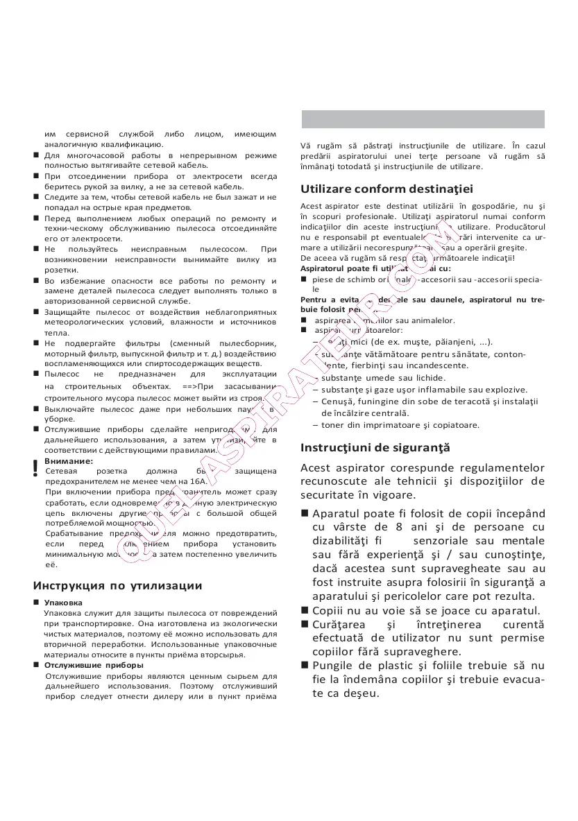 Pentru a evita accidentele sau daunele, aspiratorul nu tre-