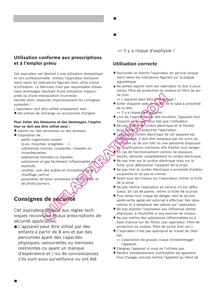 Ne jamais aspirer sans sac aspirateur ou bac à pous-