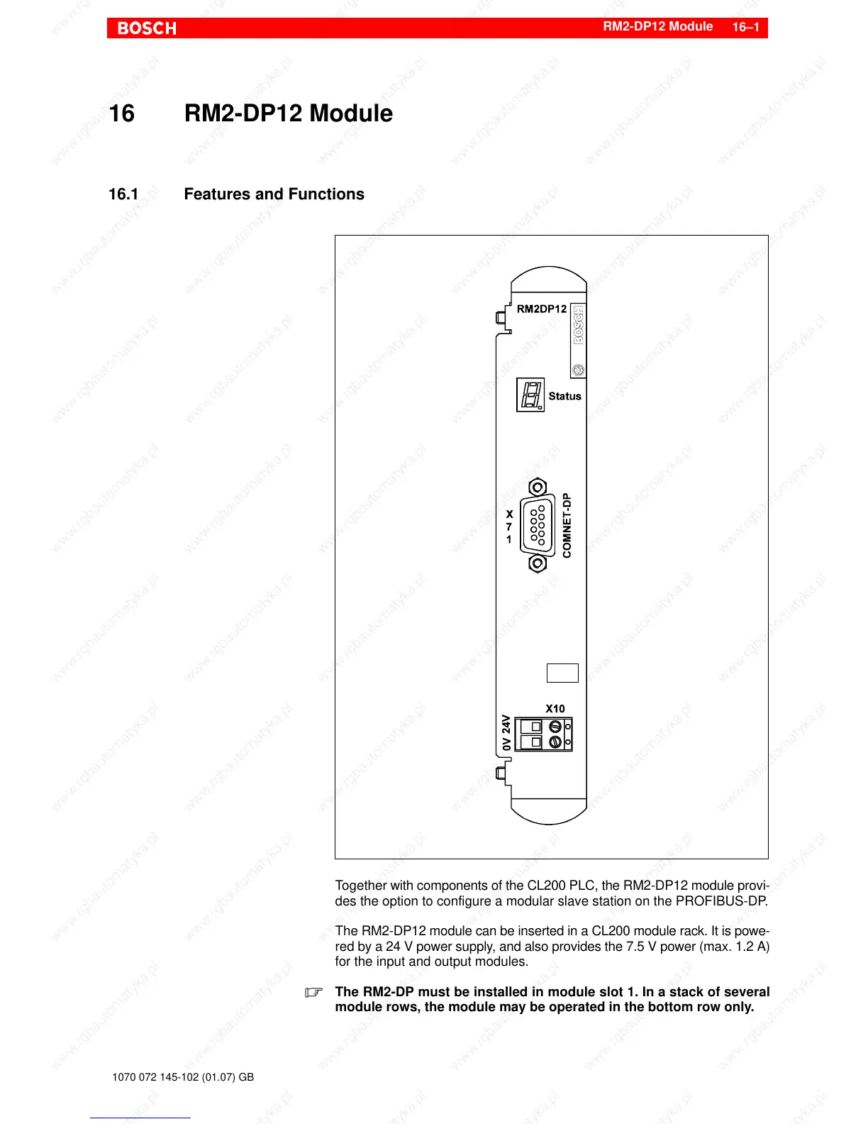 The RM2-DP12 module can be inserted in a CL200 module rack. It is powe-