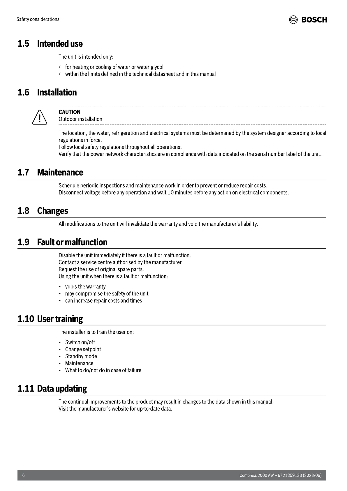 Bosch Compress 2000 AWF - Intended Use; Installation Requirements; Maintenance Schedule; Product Changes