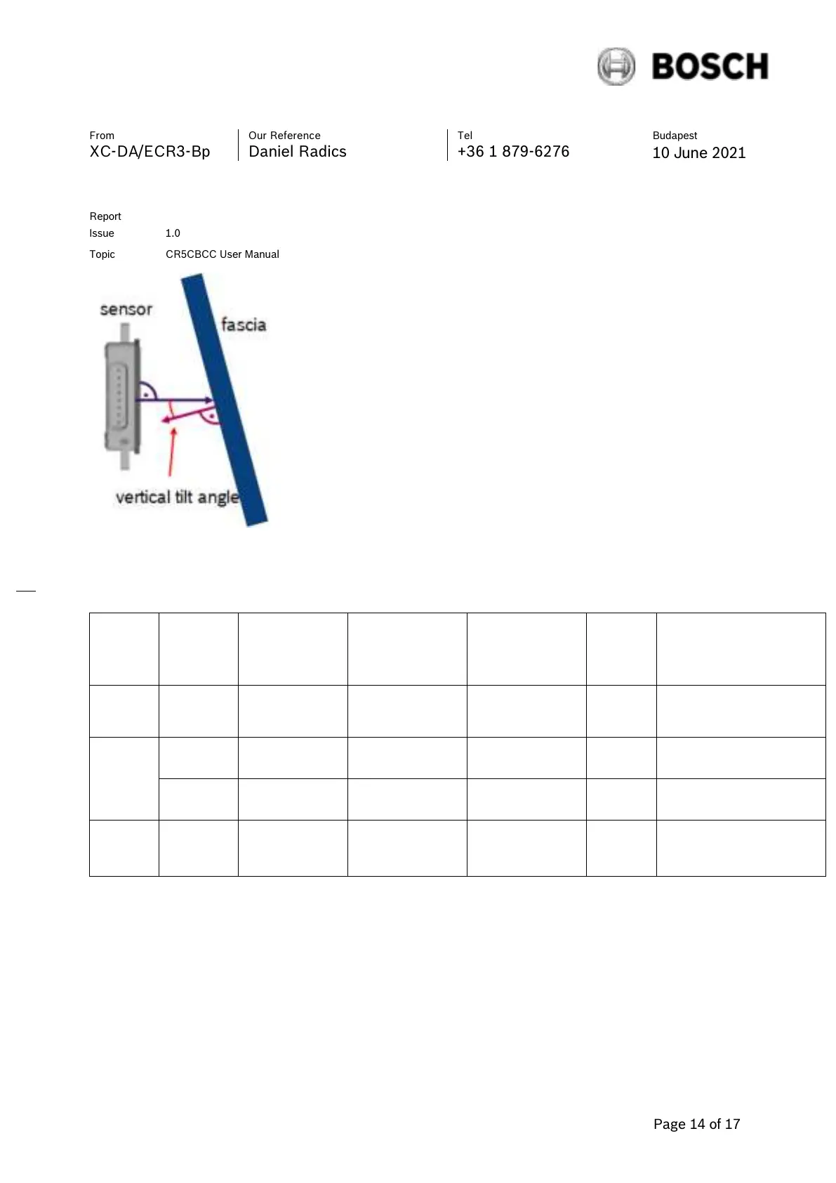 Table: minimum vertical tilt angle of fascia to sensor normal