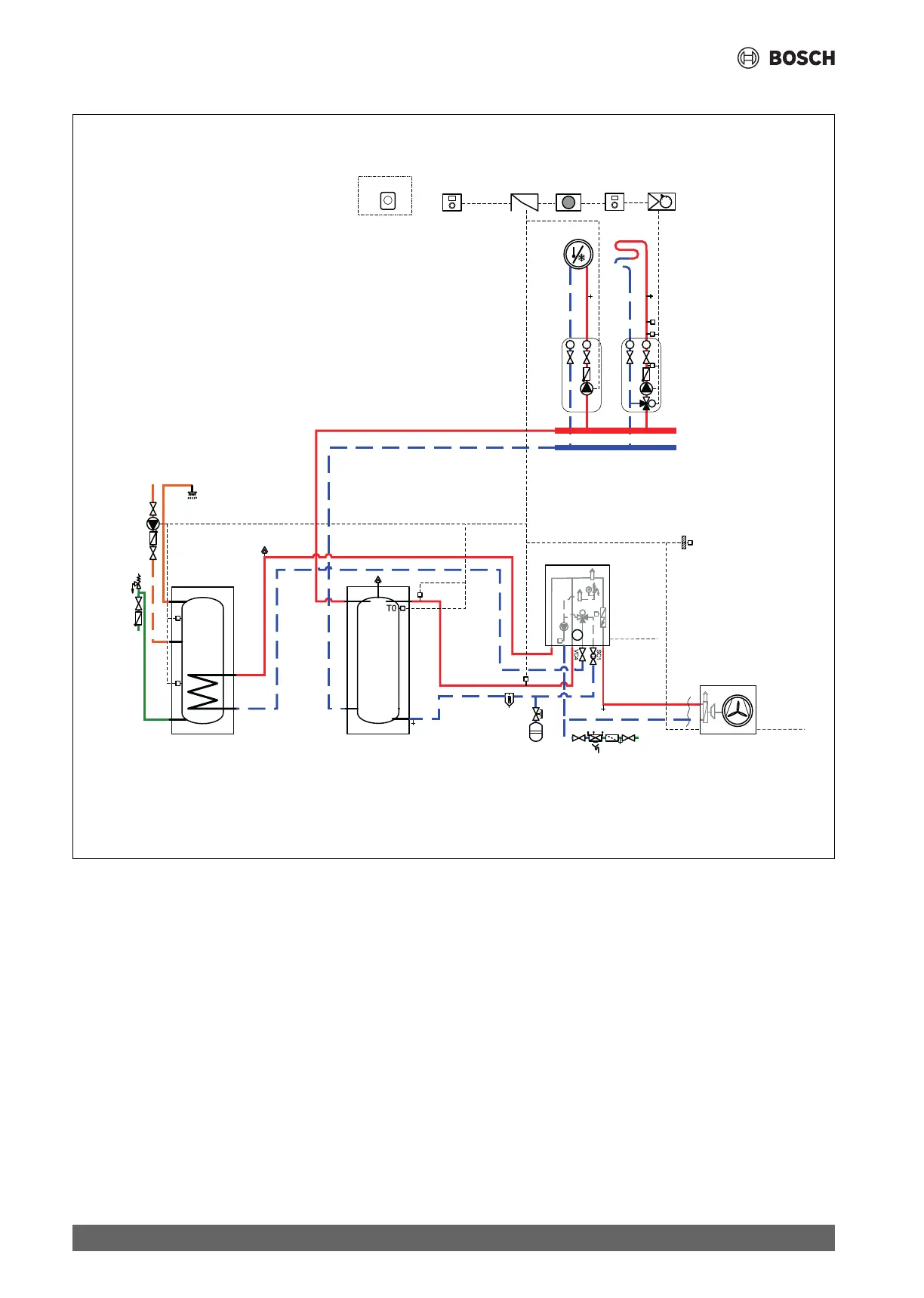 Fig. 38 Heat pump, two heating circuits, indoor unit, buffer cylinder and DHW cylinder