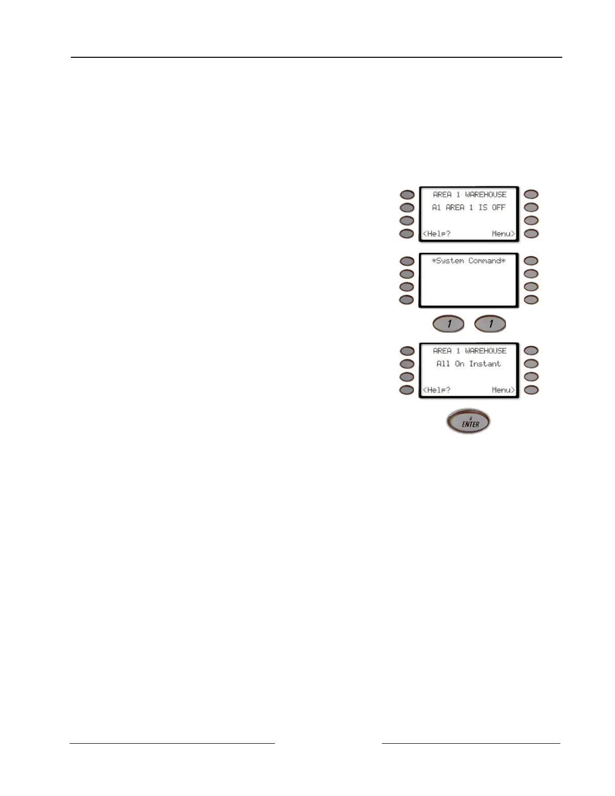 Use this function to turn on a single area, both perimeter and interior without delays. When entering COMMAND 11,