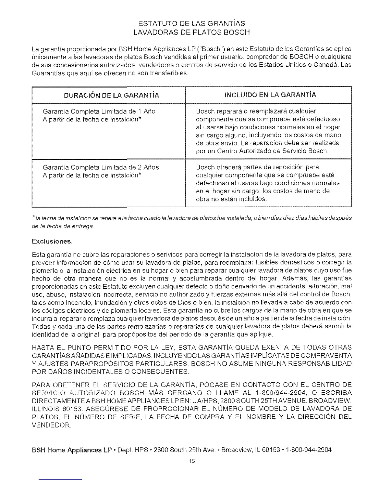 La garanfia proprcionada pot BSH Home Appliances LP ("Bosch") en este Estatuto de las Garantias se aplica