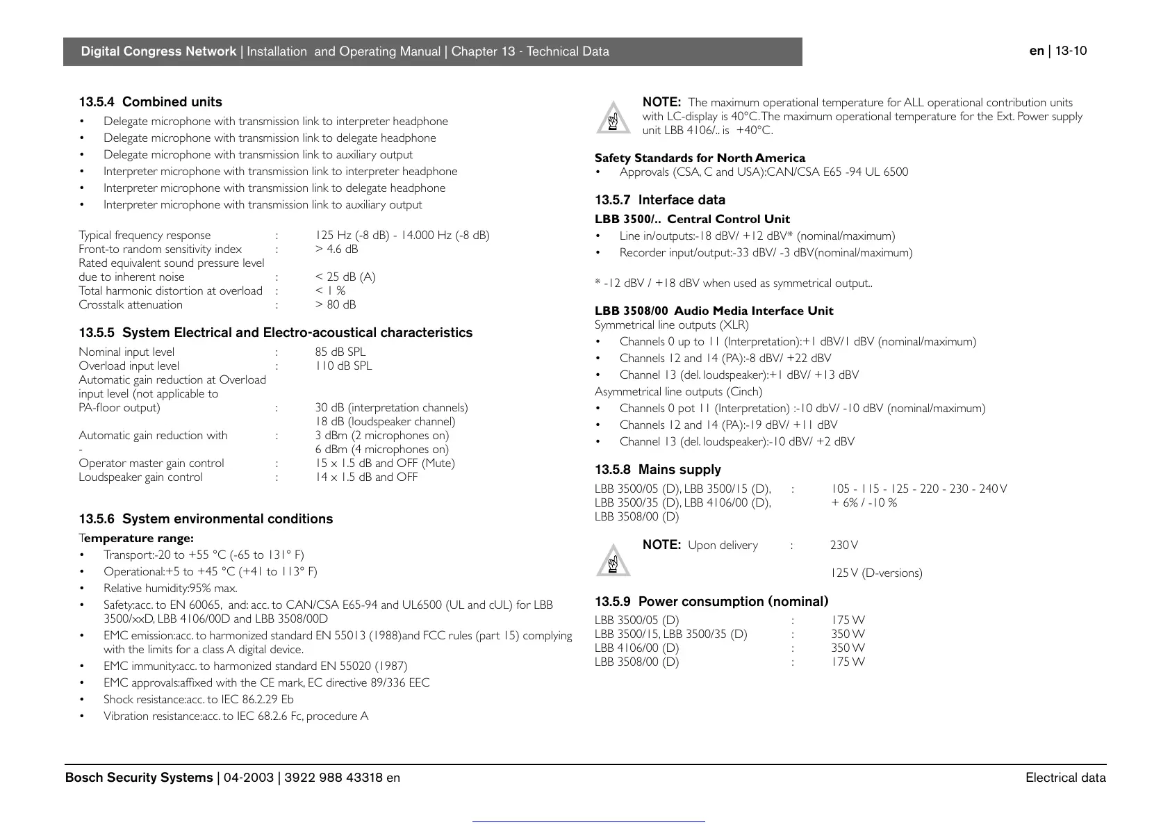 Digital Congress Network | Installation and Operating Manual | Chapter 13 - Technical Data