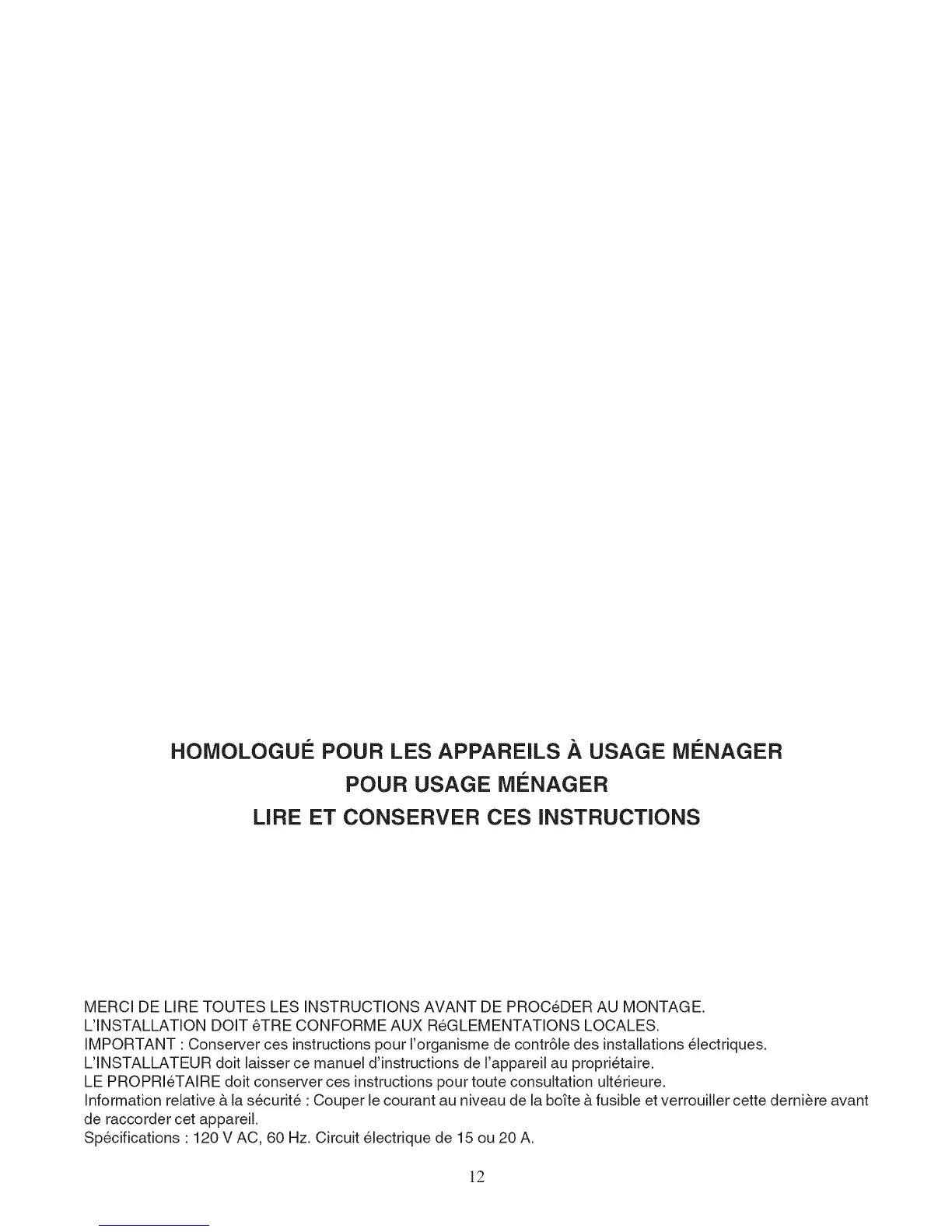 IMPORTANT : Conserver ces instructions pour I'organisme de contr61e des installations electriques.