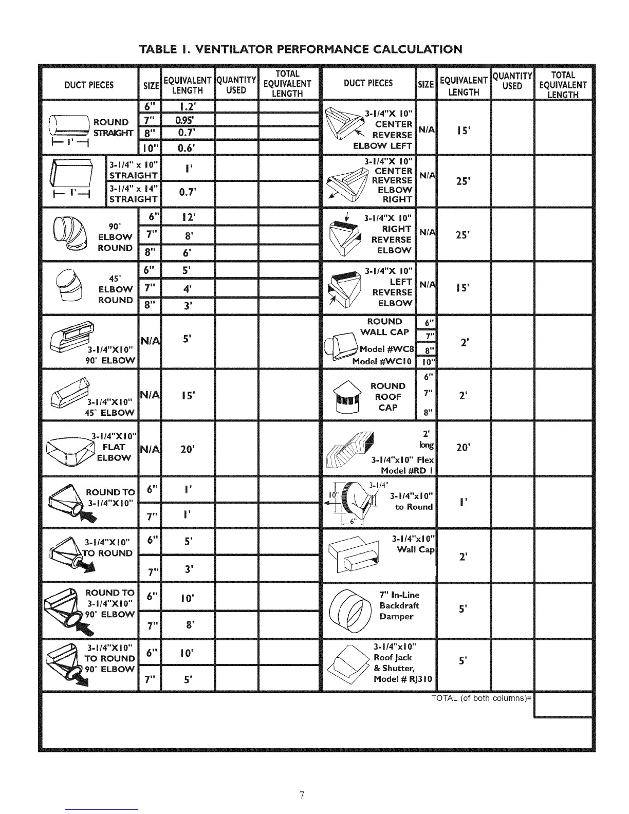 QUANTITY EQUIVALENT DUCT PIECES SIZE