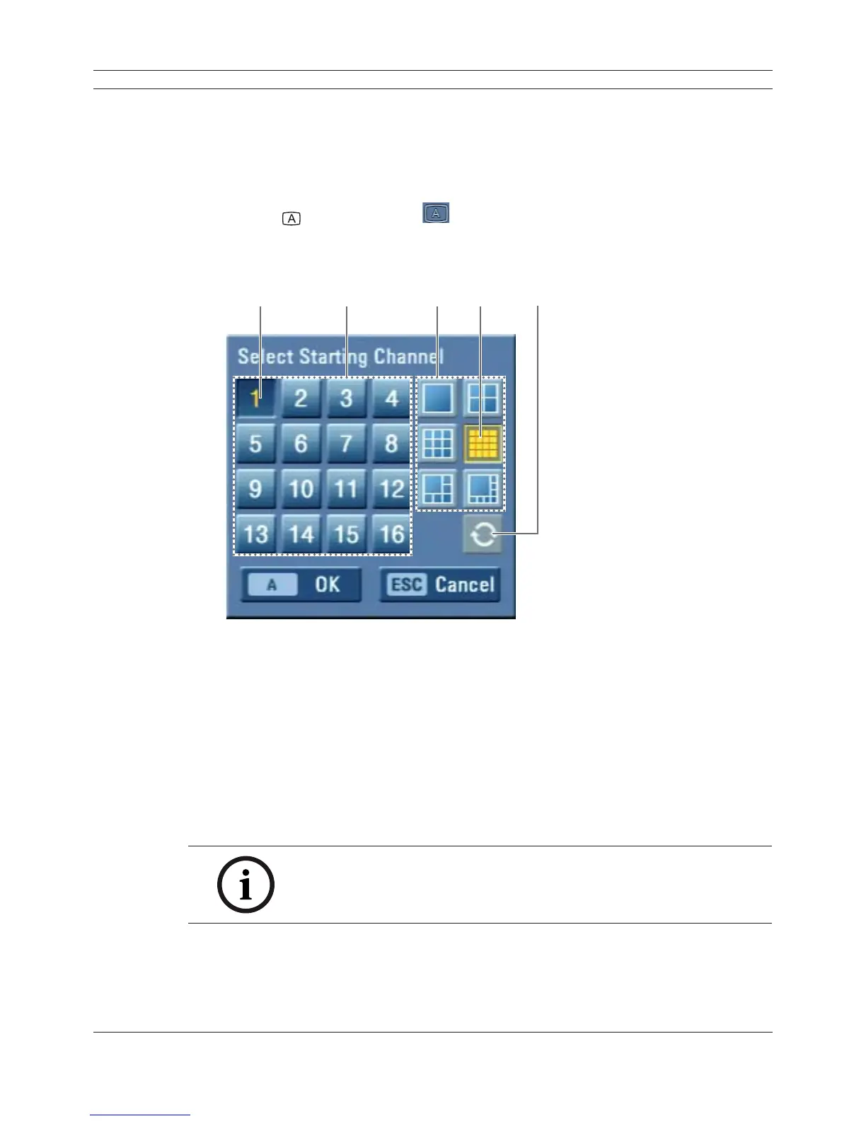 • 4, 6, 8, 9 and 16 view Mode: Displays selected multi screens on the monitor A.