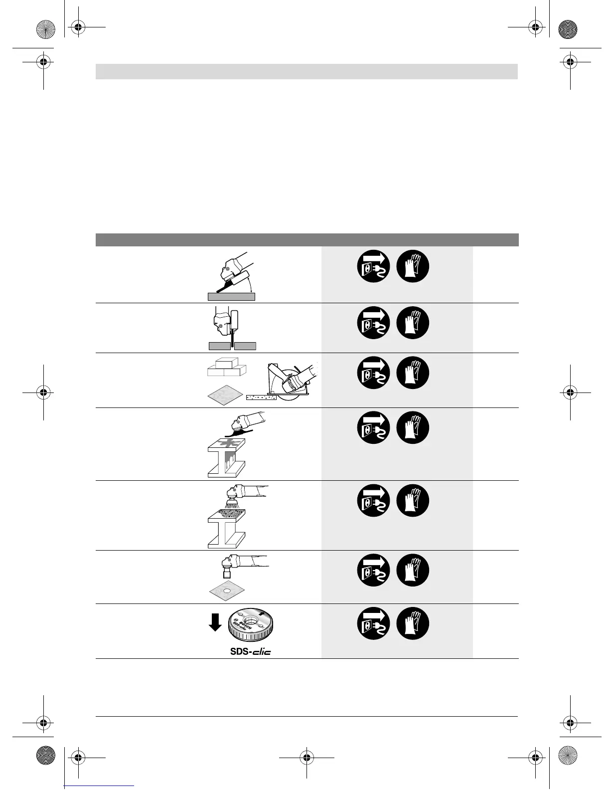 The following table indicates the action objectives for mounting and operation of the power tool. The instructions for each action