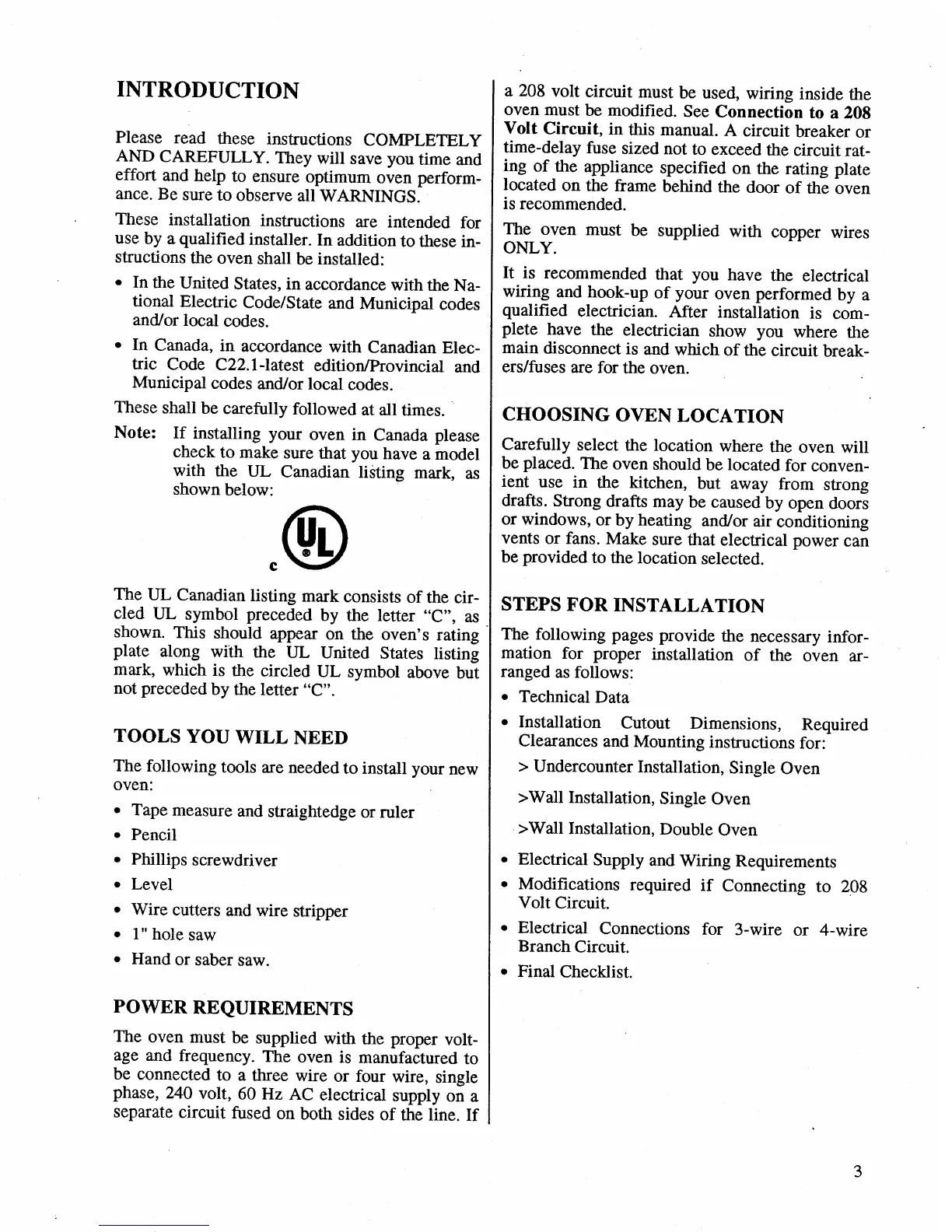 Bosch HBL 655A UC - Introduction to Oven Installation; Tools Required for Oven Installation; Oven Electrical Power Requirements; Selecting the Oven Installation Location